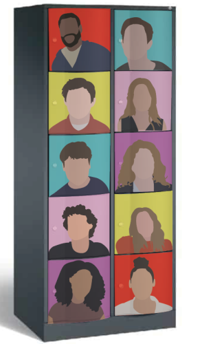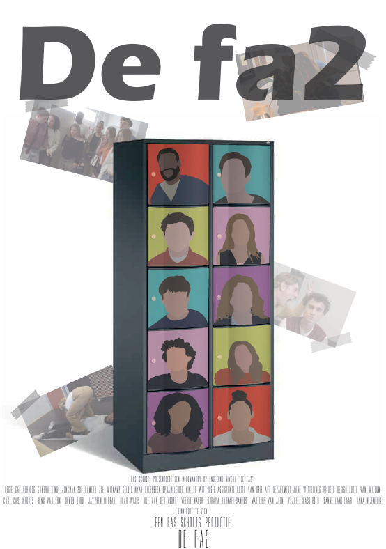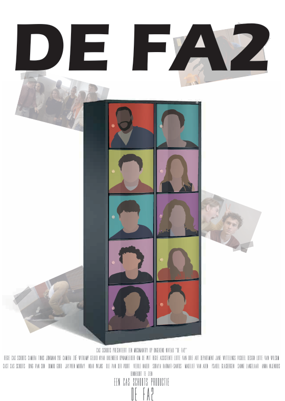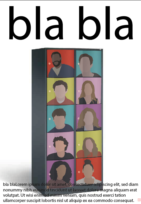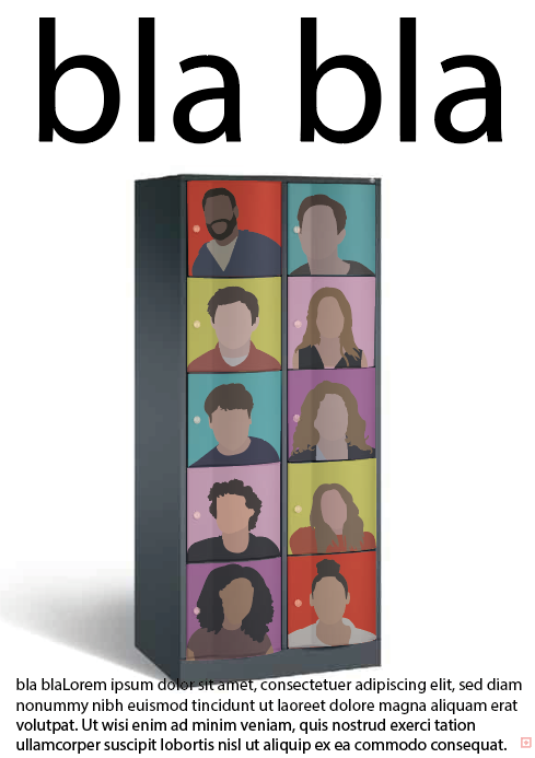 I started by adding a colored background behind the characters and then placed them on a locker, since the film takes place at school. I made the illustrations about 60% transparent so it looks like they are really stuck on the locker, like stickers that have been there for a while.