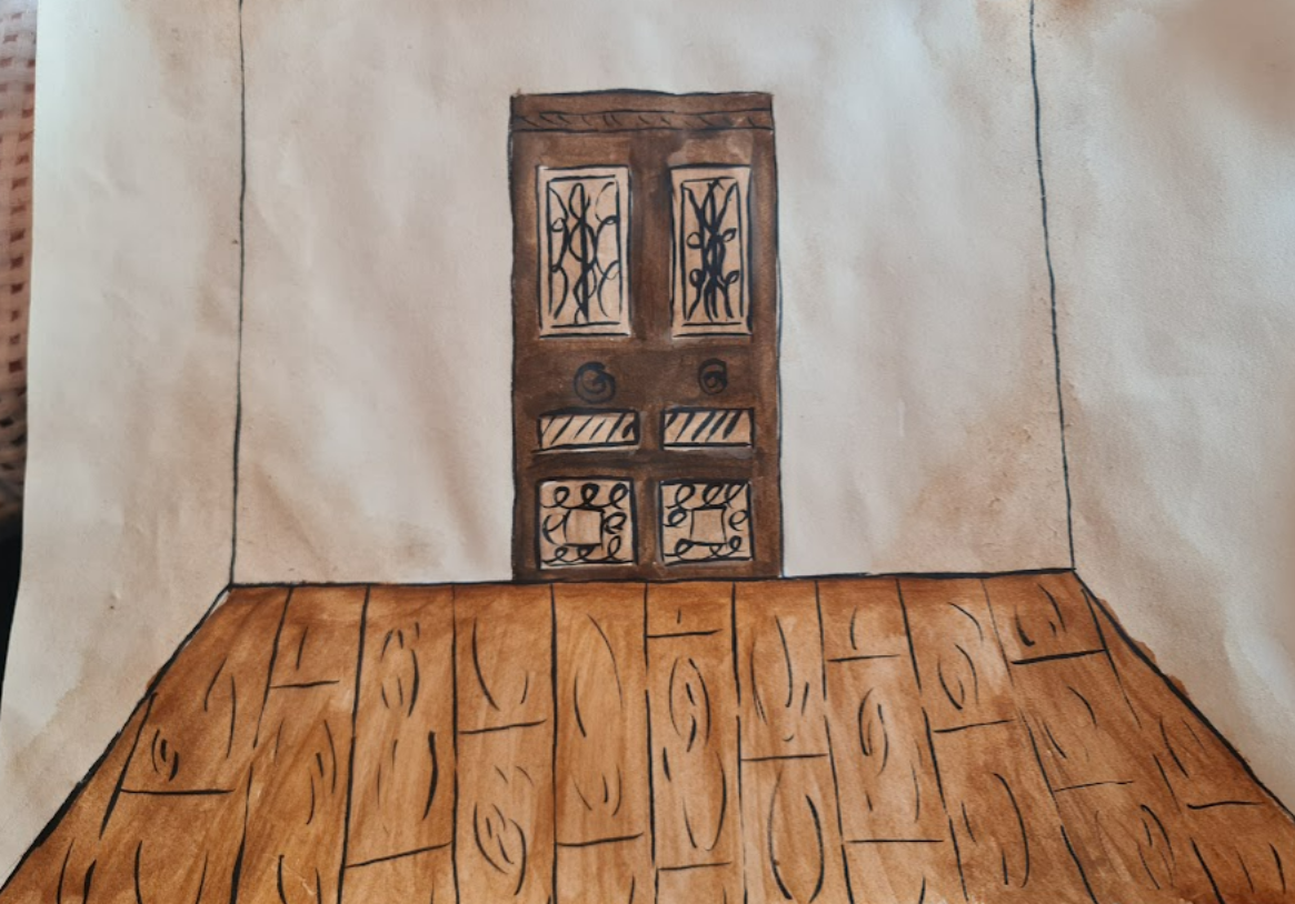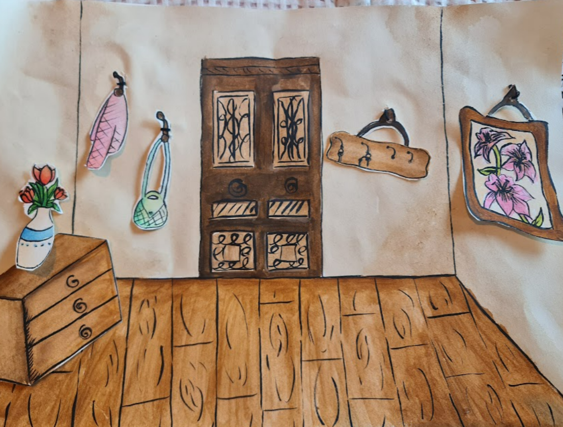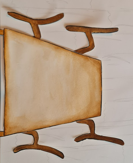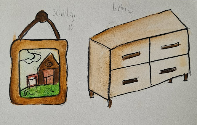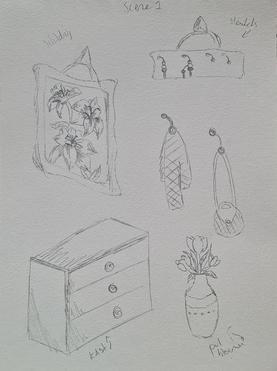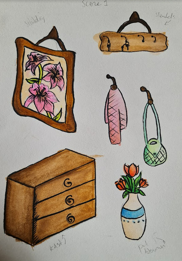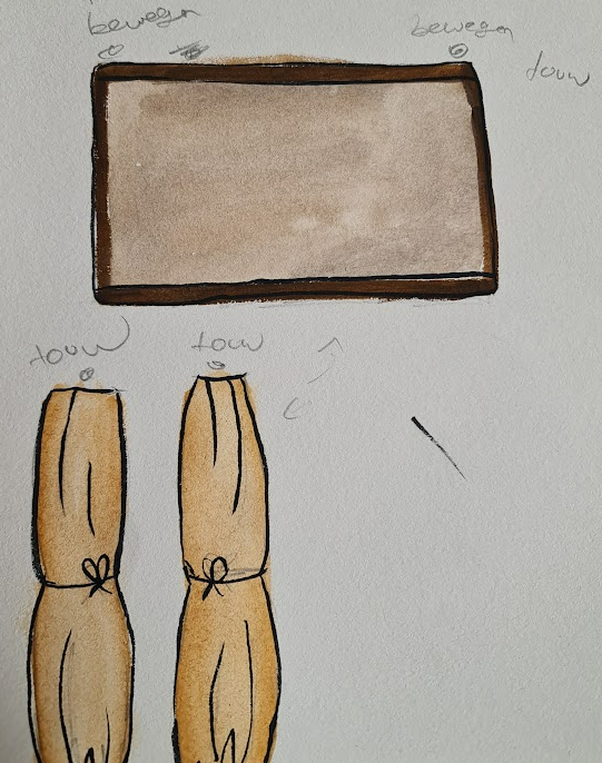 We started by sketching and deciding what exactly we wanted for the animation video. Phileine created the characters, and I made the backgrounds. In the end, we chose to work with watercolor and coffee. We also decided to keep everything separate to create a 3D effect, meaning the painting was separated from the background so we could still move it. Phileine made the characters by sewing them together with needle and thread, which allowed us to move them realistically.